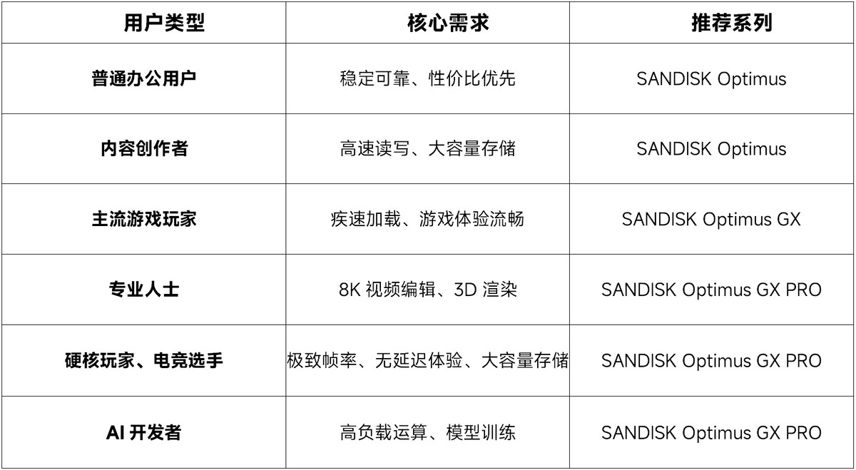 多场景覆盖:从日常办公到专业创作,从主流游戏到极限工作站,SANDISK Optimus系列构建了完整的存储生态。正如SANDISK 闪迪公司全球消费品牌与数字营销副总裁 Heidi Arkinstall 表示:“全新 SANDISK Optimus 品牌重新定义了性能标准对于消费者需求的意义。我们的产品覆盖多个细分市场,此次品牌焕新可以帮助⼴⼤消费者更加轻松地挑选合适的产品。”